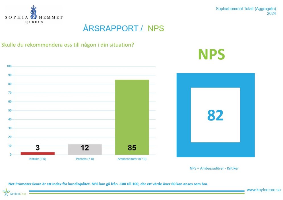 Vi mäter NPS – Net Promoter Score som bygger på frågan: Skulle du rekommendera oss till någon i samma situation? Patienten svarar enligt en skala mellan 0-10, där 0 innebär inte alls sannolikt och 10 innebär högst sannolikt. Det sammanlagda resultatet ger värden -100 till +100. Vårt totala NPS-resultat 2024 blev 82, vilket är ett utmärkt resultat.