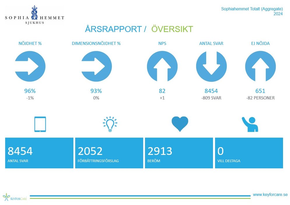 2024 besvarade totalt 8454 patienter på Sophiahemmet AB:s enkät efter sitt besök på någon av våra egna enheter; Vårdenheten, Husläkarmottagningen, Försäkringsmottagningen eller Hälsocentralen. 2912 beröm kom in samt 2051 förbättringsförslag.