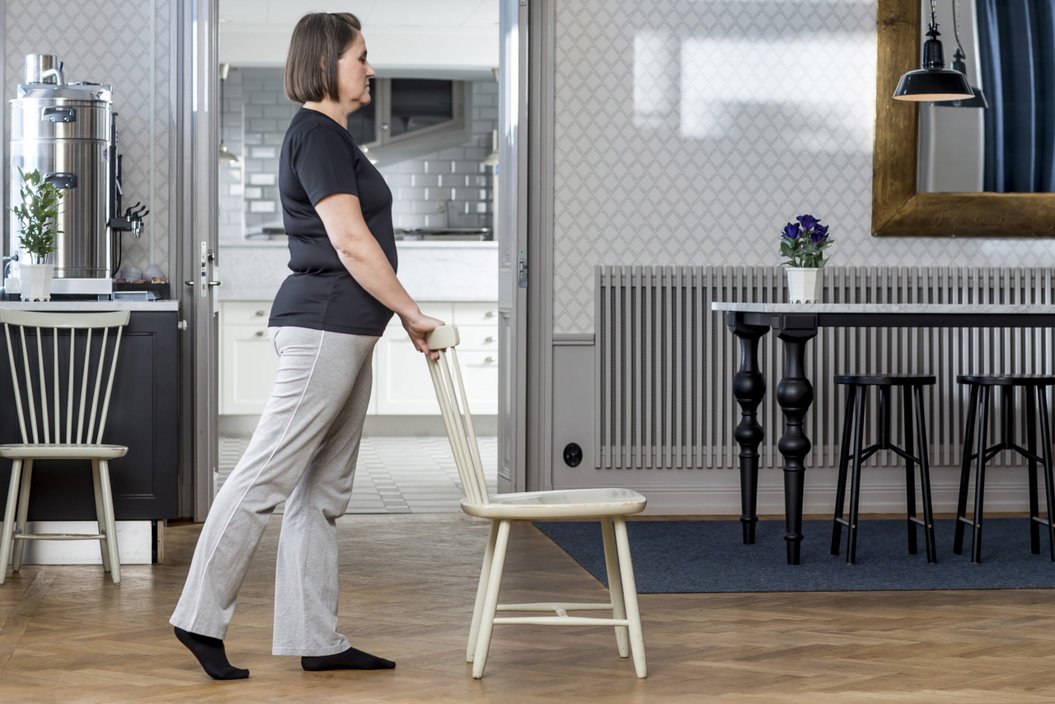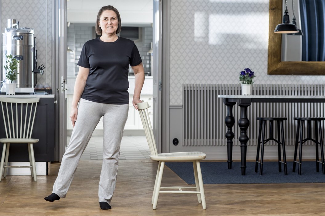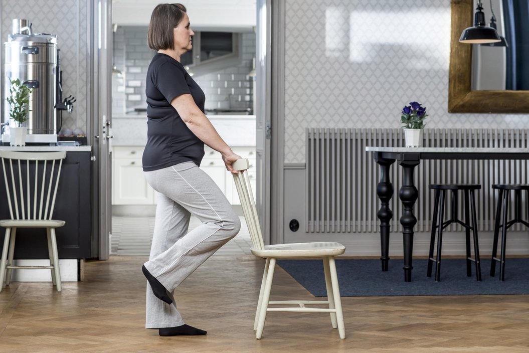 Stående med handstöd. Böj upp det opererande benet.