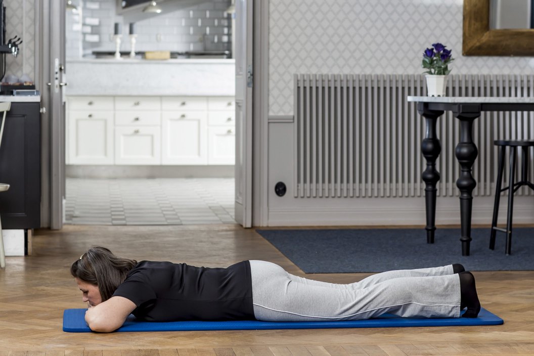 Ett par veckor efter operationen är det bra att vila en stund på mage varje dag, för att sträcka ut höftleden.