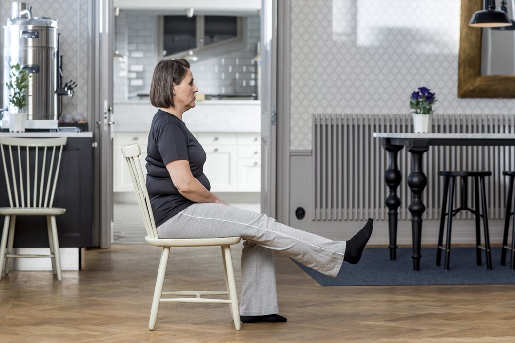 Sittande på sängkanten. Sträck knäleden så benet blir rakt.